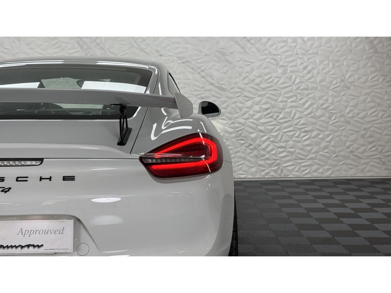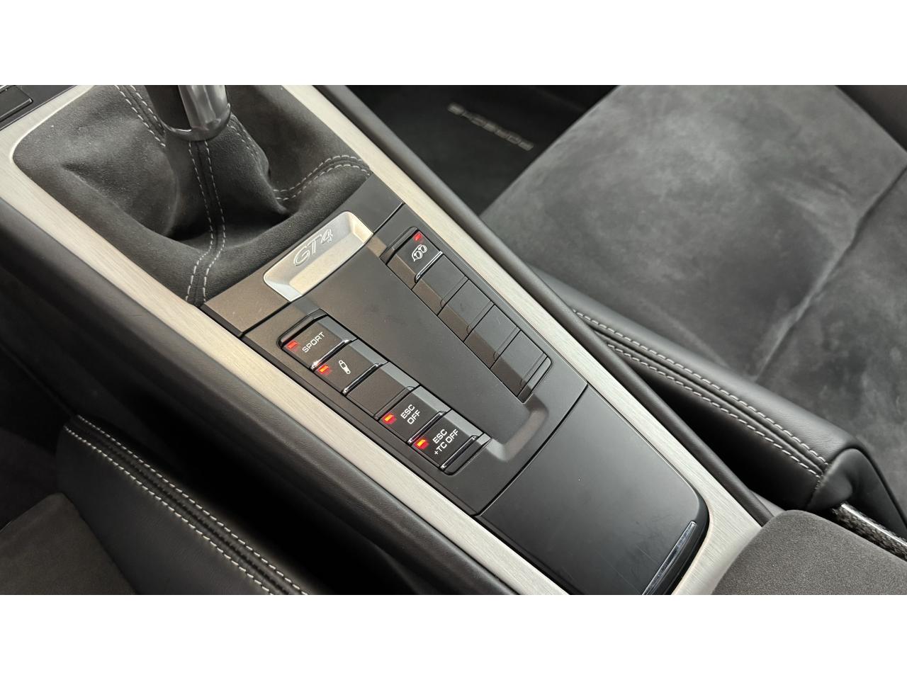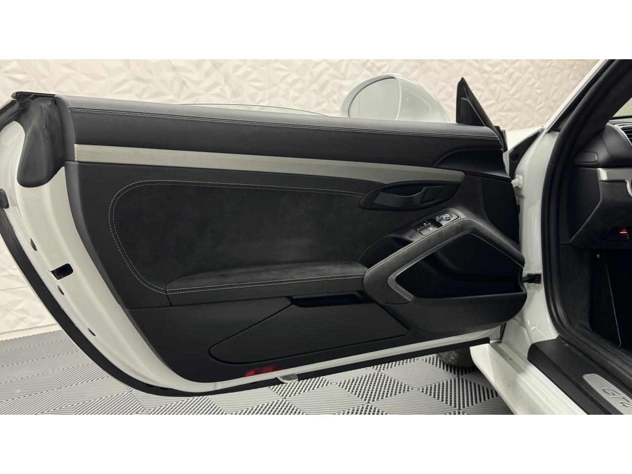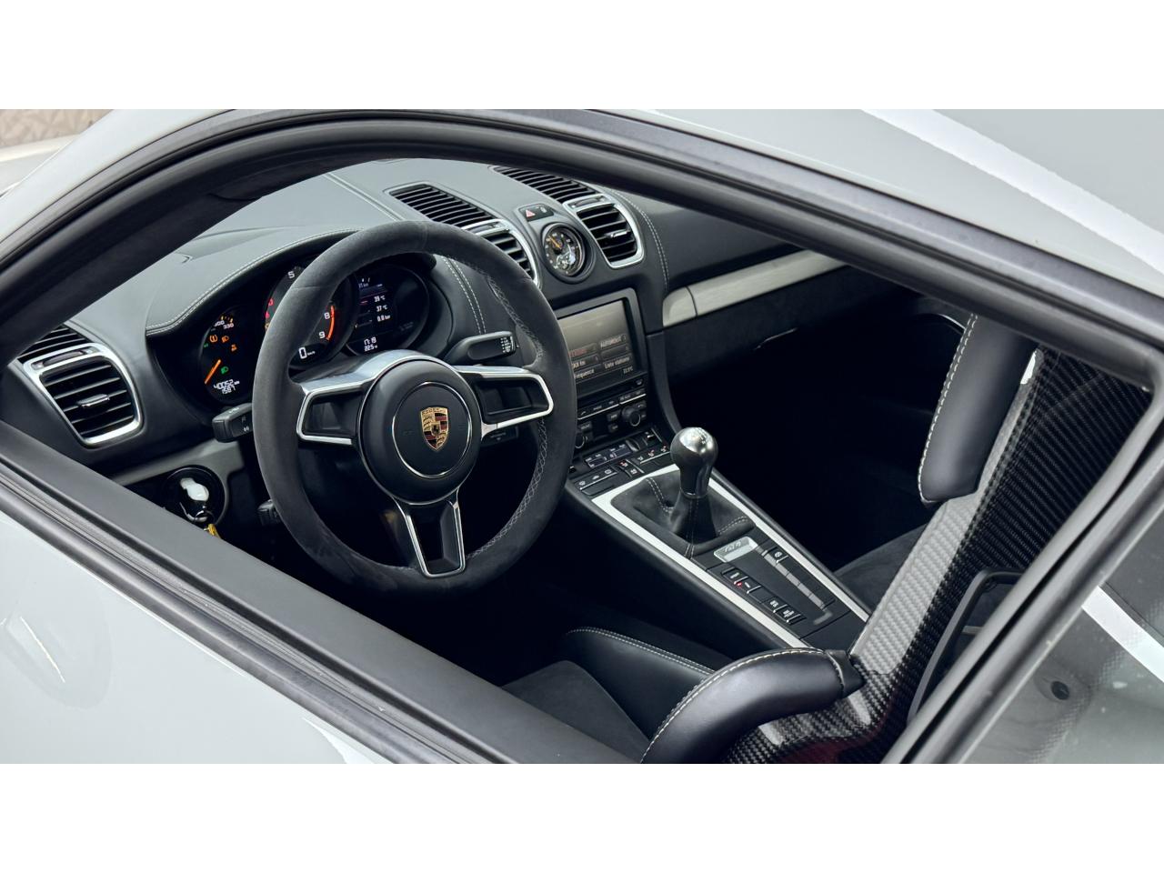 3 instruments ronds intégrés dans le cockpitAffichage analogique : régime, vitesse et jauge de carburantAffichage numérique permanent : kilométrage parcouru, kilométrage quotidien, heure, température extérieure et vitesseAirbags grand volume (deux niveaux de gonflage) pour le conducteur et le passagerAssistant d’éclairage automatique avec éclairage d’accompagnementBoîte à gants verrouillableBoîte manuelle 6 rapports avec volant bi-masse, embrayage à rattrapage automatique d’usureCeintures de sécurité automatiques à 3 points à l'avant, boucles de ceinture sur les siègesCoupé 2 placesDirection assistée électromécanique à démultiplication variableDispositif de contrôle de l'usure des freins sur chaque plaquetteEntrées d'air dans l'habillage des parties latérales arrière avec sideblades et inscription « GT4 » estampéeÉtriers fixes monobloc rouges en aluminium à 6 pistons à l'avant et 4 pistons à l'arrière, disques de freins, ventilés et ajourés avec moyeux en aluminium, diamètre 380 mm à l'avant et à l'arrièreFrein de parking électriqueLève-vitre électrique avec fonction à impulsion haut/bas et abaissement automatique de la vitrePhares Bi-Xénon avec clignotants intégrésSignature « PORSCHE » et inscription « GT4 » en Noir sur bouclier arrièreSystème antidémarrage avec verrouillage centralisé et télécommande, système d’alarmeSystème de contrôle de la pression des pneus (TPM) avec mode CircuitTableau de bord avec compte-tours central, écran TFT couleur haute définition de 4,6 pouces avec affichage des fonctions de l'ordinateur de bord, éclairé en blancTeinte extérieure BlancTouche SPORT avec double débrayageVide-poches dans les portières et à côté du cache-moteurVolant sport GT4 avec couronne de volant en Alcantara module d’airbag en cuir, diamètre du volant de 360 mm, réglable manuellement en hauteur et profondeur