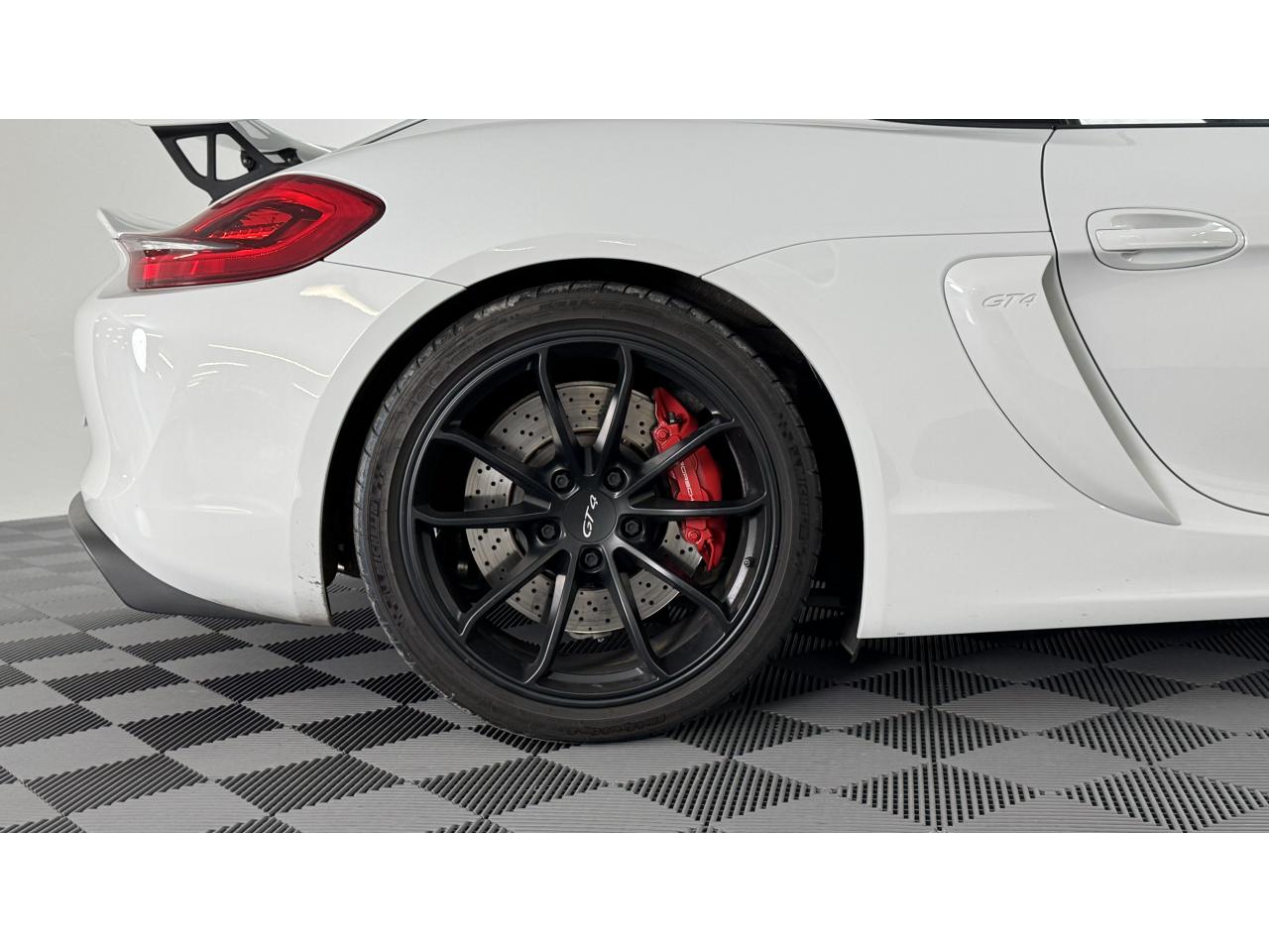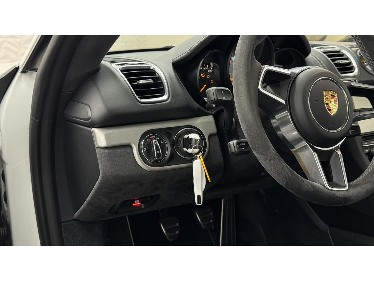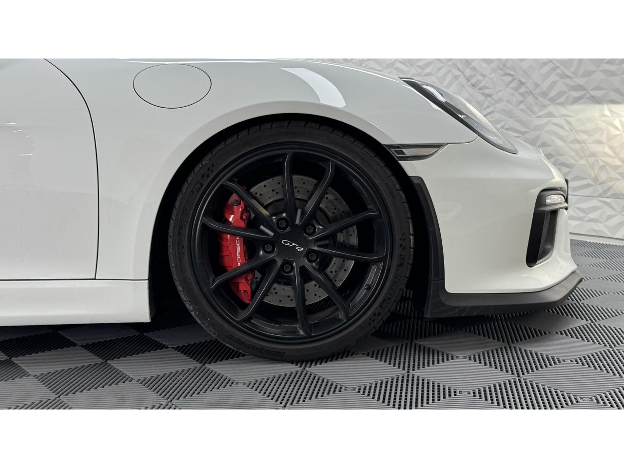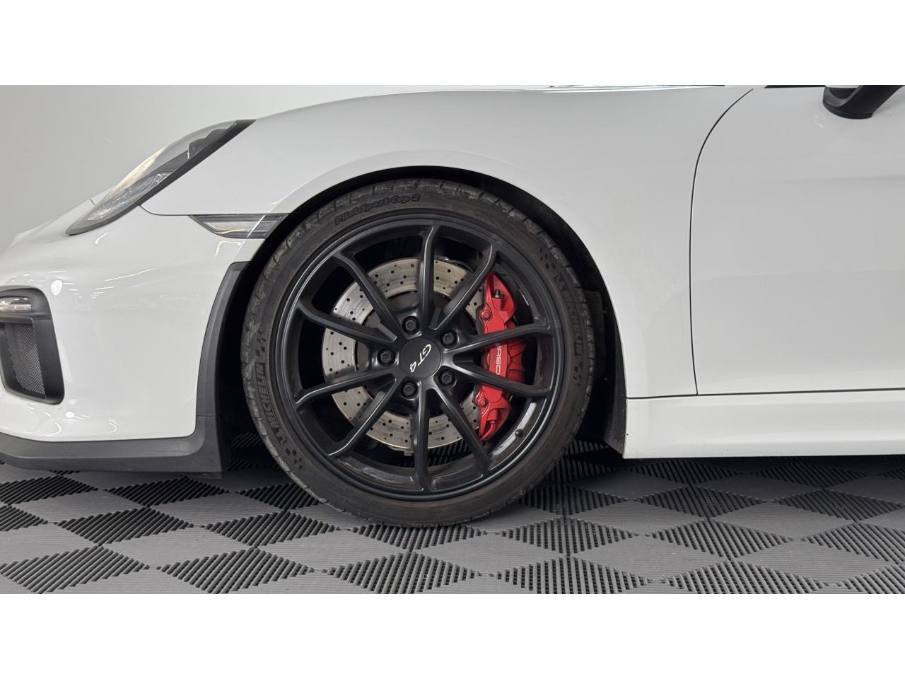 3 instruments ronds intégrés dans le cockpitAffichage analogique : régime, vitesse et jauge de carburantAffichage numérique permanent : kilométrage parcouru, kilométrage quotidien, heure, température extérieure et vitesseAirbags grand volume (deux niveaux de gonflage) pour le conducteur et le passagerAssistant d’éclairage automatique avec éclairage d’accompagnementBoîte à gants verrouillableBoîte manuelle 6 rapports avec volant bi-masse, embrayage à rattrapage automatique d’usureCeintures de sécurité automatiques à 3 points à l'avant, boucles de ceinture sur les siègesCoupé 2 placesDirection assistée électromécanique à démultiplication variableDispositif de contrôle de l'usure des freins sur chaque plaquetteEntrées d'air dans l'habillage des parties latérales arrière avec sideblades et inscription « GT4 » estampéeÉtriers fixes monobloc rouges en aluminium à 6 pistons à l'avant et 4 pistons à l'arrière, disques de freins, ventilés et ajourés avec moyeux en aluminium, diamètre 380 mm à l'avant et à l'arrièreFrein de parking électriqueLève-vitre électrique avec fonction à impulsion haut/bas et abaissement automatique de la vitrePhares Bi-Xénon avec clignotants intégrésSignature « PORSCHE » et inscription « GT4 » en Noir sur bouclier arrièreSystème antidémarrage avec verrouillage centralisé et télécommande, système d’alarmeSystème de contrôle de la pression des pneus (TPM) avec mode CircuitTableau de bord avec compte-tours central, écran TFT couleur haute définition de 4,6 pouces avec affichage des fonctions de l'ordinateur de bord, éclairé en blancTeinte extérieure BlancTouche SPORT avec double débrayageVide-poches dans les portières et à côté du cache-moteurVolant sport GT4 avec couronne de volant en Alcantara module d’airbag en cuir, diamètre du volant de 360 mm, réglable manuellement en hauteur et profondeur