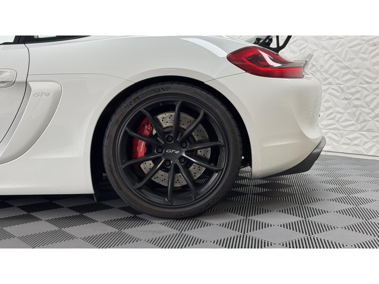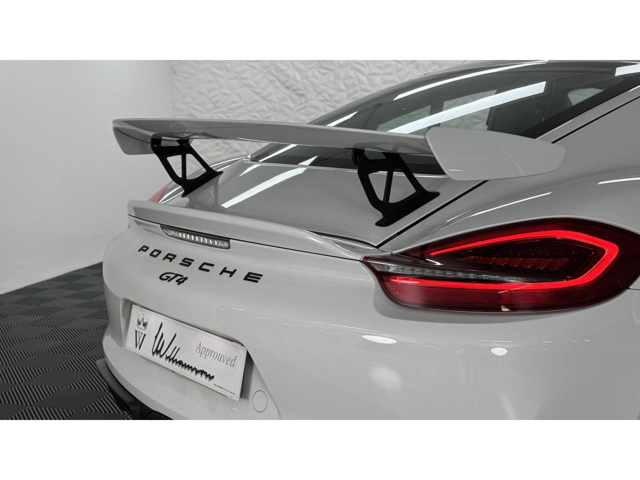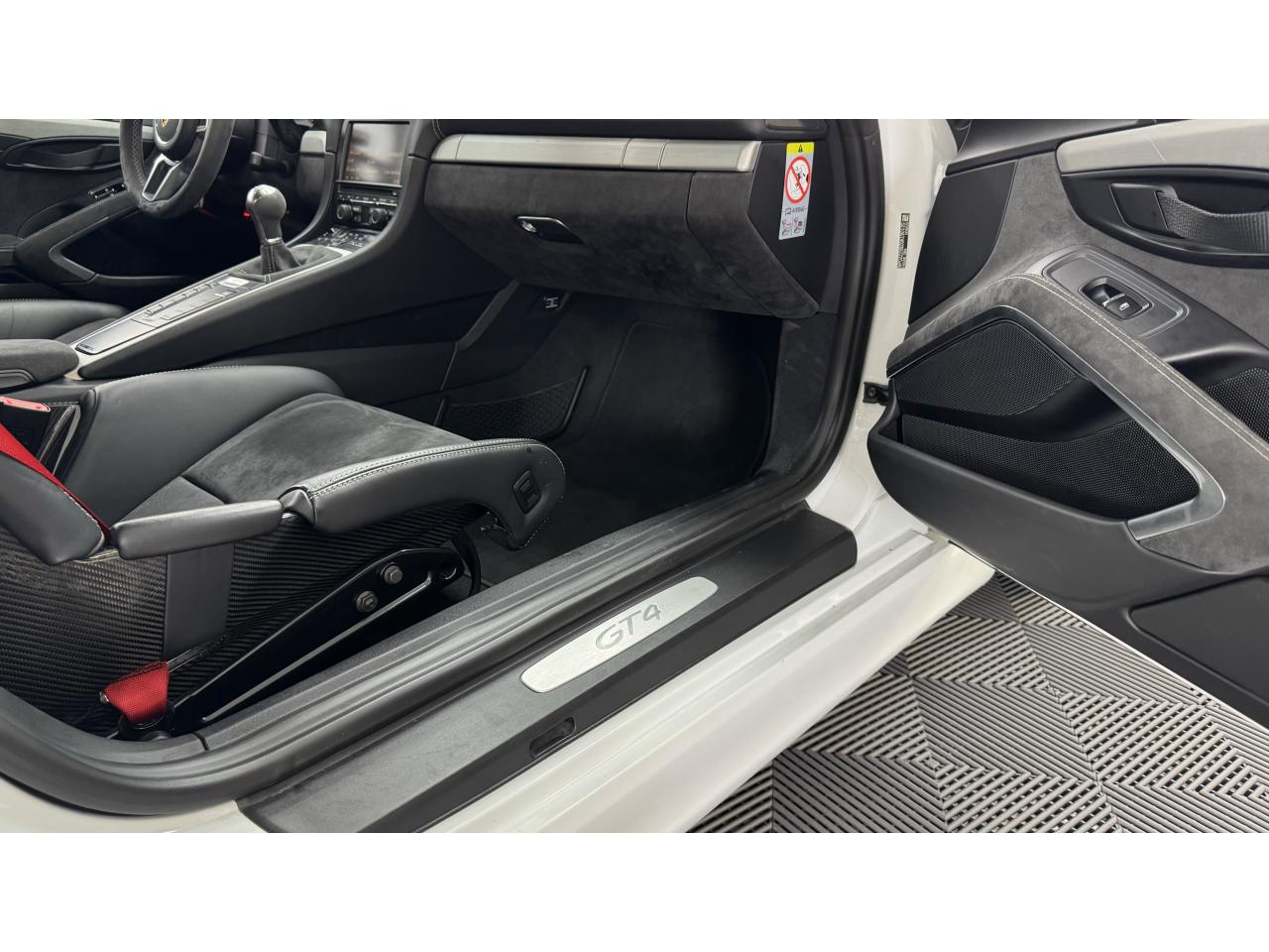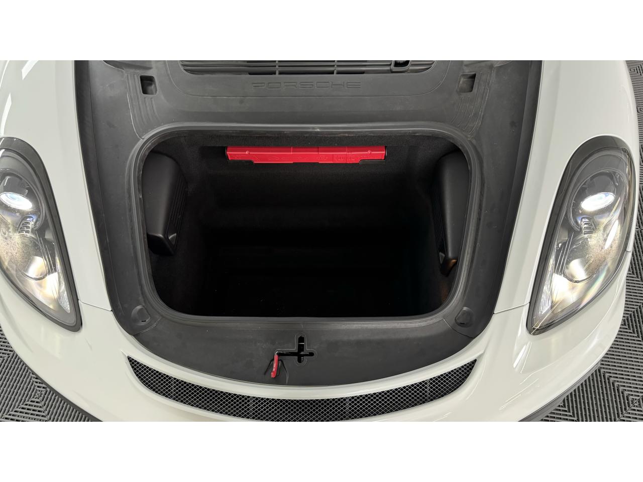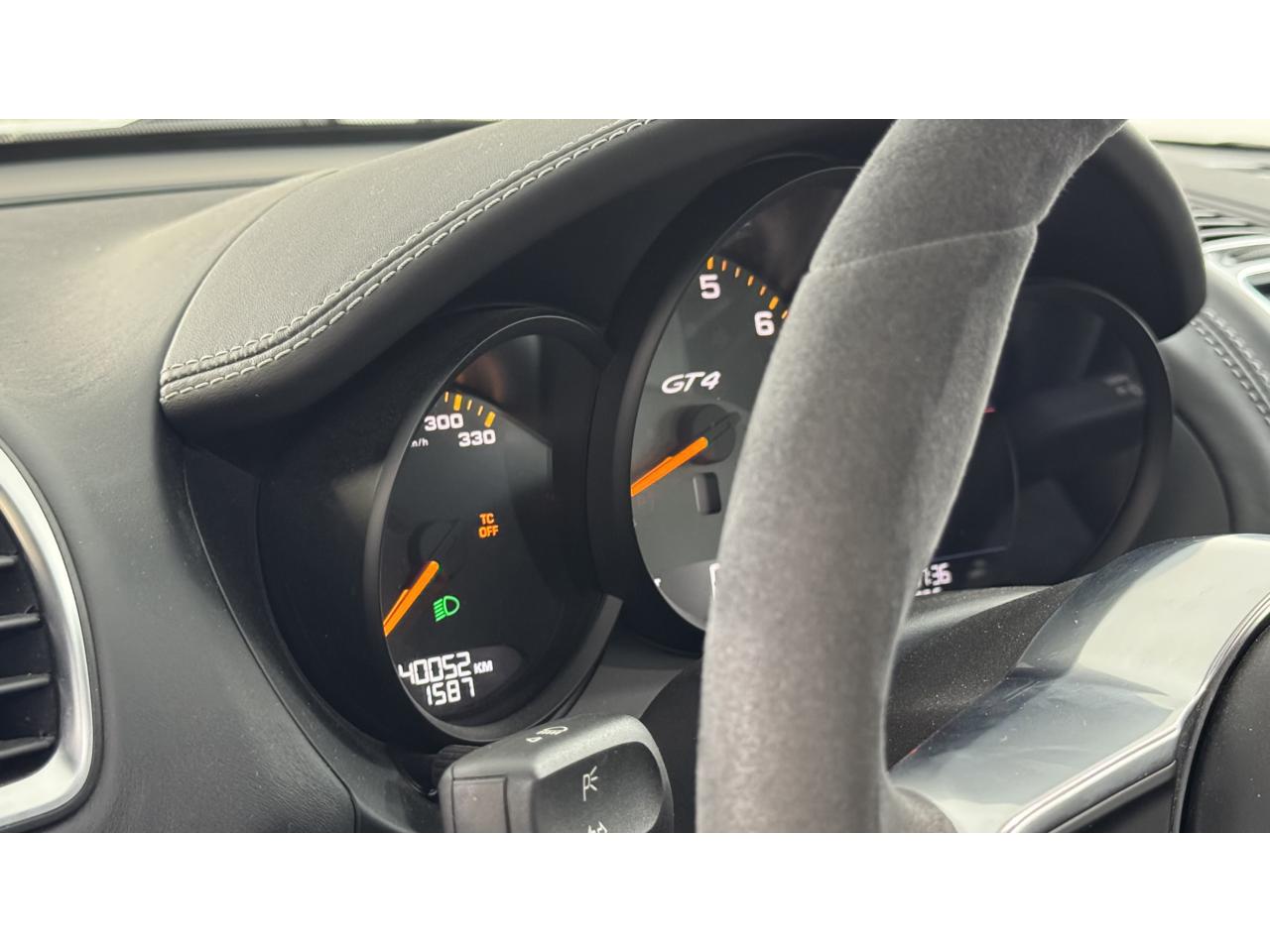 3 instruments ronds intégrés dans le cockpitAffichage analogique : régime, vitesse et jauge de carburantAffichage numérique permanent : kilométrage parcouru, kilométrage quotidien, heure, température extérieure et vitesseAirbags grand volume (deux niveaux de gonflage) pour le conducteur et le passagerAssistant d’éclairage automatique avec éclairage d’accompagnementBoîte à gants verrouillableBoîte manuelle 6 rapports avec volant bi-masse, embrayage à rattrapage automatique d’usureCeintures de sécurité automatiques à 3 points à l'avant, boucles de ceinture sur les siègesCoupé 2 placesDirection assistée électromécanique à démultiplication variableDispositif de contrôle de l'usure des freins sur chaque plaquetteEntrées d'air dans l'habillage des parties latérales arrière avec sideblades et inscription « GT4 » estampéeÉtriers fixes monobloc rouges en aluminium à 6 pistons à l'avant et 4 pistons à l'arrière, disques de freins, ventilés et ajourés avec moyeux en aluminium, diamètre 380 mm à l'avant et à l'arrièreFrein de parking électriqueLève-vitre électrique avec fonction à impulsion haut/bas et abaissement automatique de la vitrePhares Bi-Xénon avec clignotants intégrésSignature « PORSCHE » et inscription « GT4 » en Noir sur bouclier arrièreSystème antidémarrage avec verrouillage centralisé et télécommande, système d’alarmeSystème de contrôle de la pression des pneus (TPM) avec mode CircuitTableau de bord avec compte-tours central, écran TFT couleur haute définition de 4,6 pouces avec affichage des fonctions de l'ordinateur de bord, éclairé en blancTeinte extérieure BlancTouche SPORT avec double débrayageVide-poches dans les portières et à côté du cache-moteurVolant sport GT4 avec couronne de volant en Alcantara module d’airbag en cuir, diamètre du volant de 360 mm, réglable manuellement en hauteur et profondeur